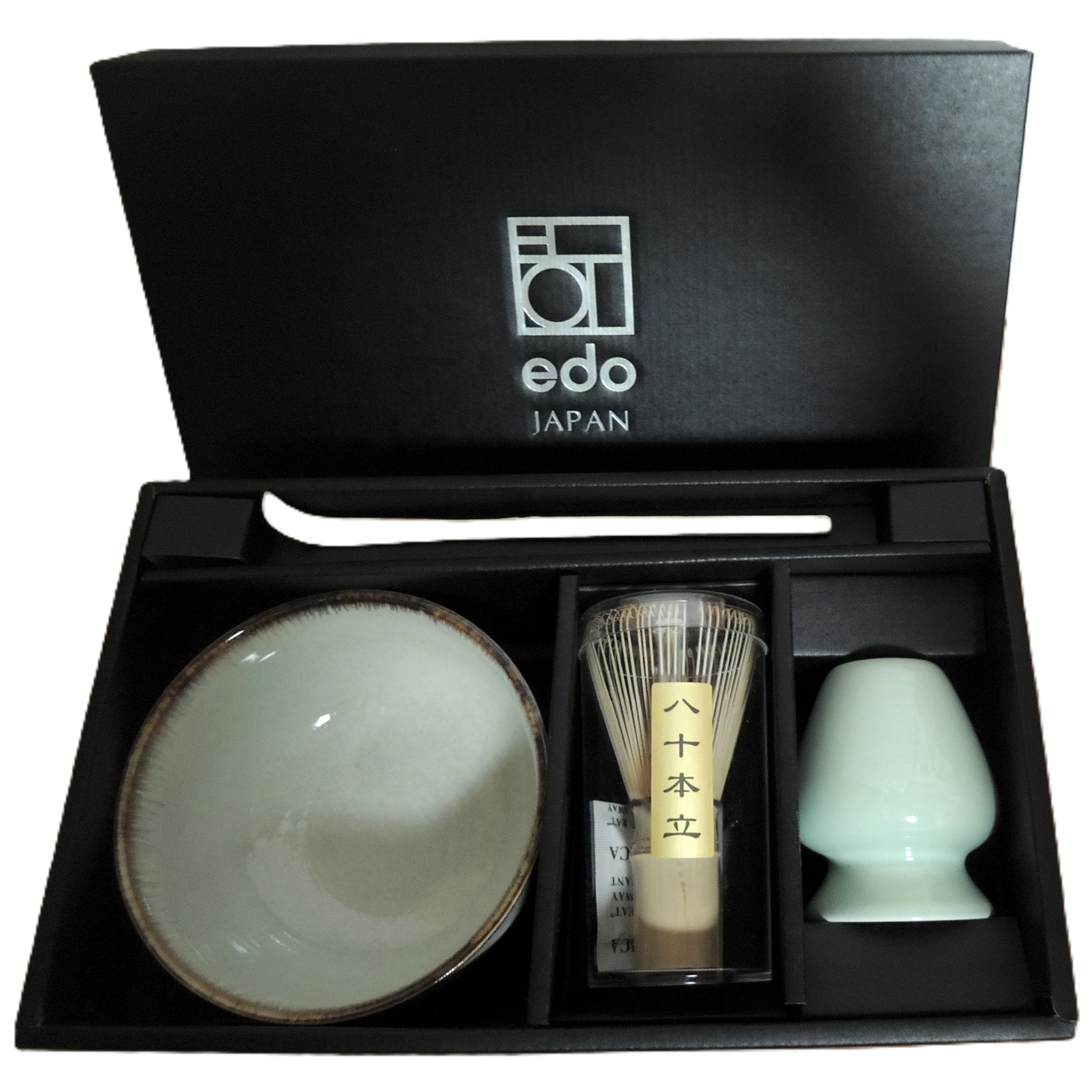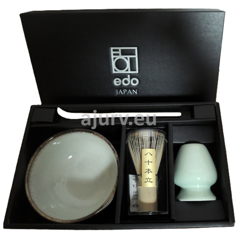 Set pro přípravu japonského práškového čaje Matcha. Set se skládá z ručně vyráběné misky tzv. Chawan [čavan], kvalitnější bambusové metličky - Chasen [časen], bambusové lžičky pro správné odměření matchy - Chashaku [čašaku (1.pád)] a stojánek na chasen - Kusenaoshi [kusenaoši]. To vše v pěkné černé dárkové krabici. A navíc matcha čaj Kyoto 30g v kovové dozičce a publikace výběru básní haiku.